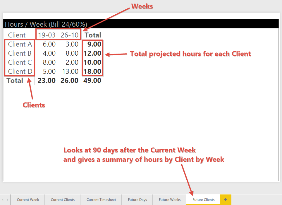 - The 3 “Future” tabs above all look at the 90 days following the current week
