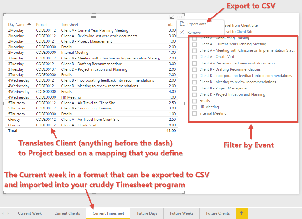 Note: The first screenshot is from my Outlook calendar and it is the sample data from May 2017 that was used to populate A Power BI Timesheet.pbix with the data used in the screenshots that follow.