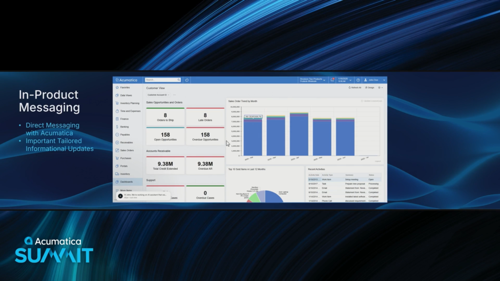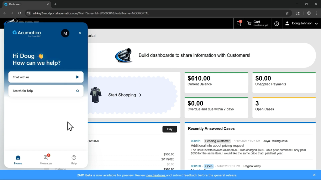 Here’s an example of an Acumatica Customer using the Acumatica Portal to show their own notification messages on the bottom, message inbox (2 unread) on the top, and the AI Agent on the left.