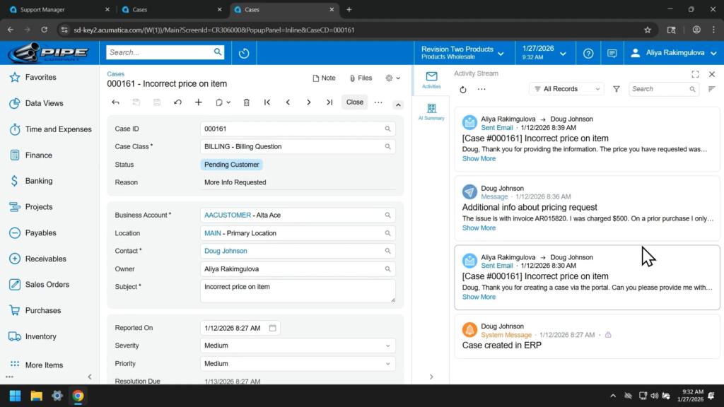 The regular Acumatica customer-specific pricing kicks in as well, which you can see when Doug increases the quantity.