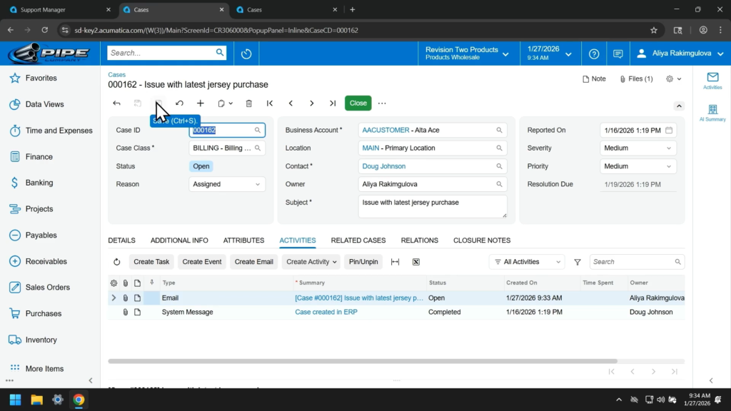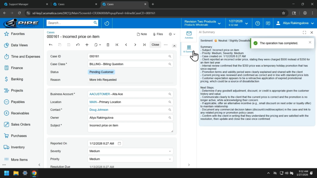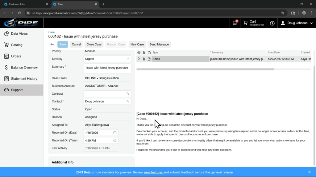 Now on Aliya’s computer, we see what it looks like for the support person who is working the case.