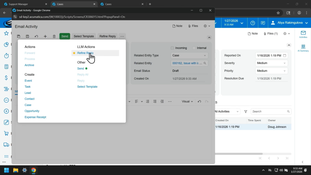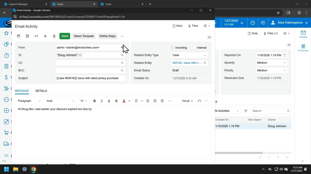 Now Aliya clicks the Create Email button and types a somewhat terse response to Doug 😀