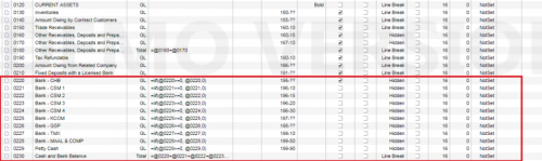 Im in midst of creating Balance Sheet for my company using Acumatica Report Manager (Report Writter). Herewith I attached the GL Code and amount for bank balances. My Finance Manager wants the bank balances to show in the balance sheet as per attachment. Can you please guide my how to set Cash and Bank Balances in balance sheet by condition if equal or more than zero, reflect in current asset and if less than zero, reflect in current liability. Thank you.