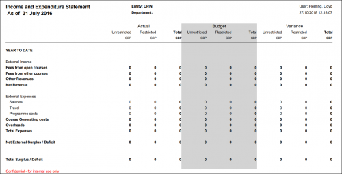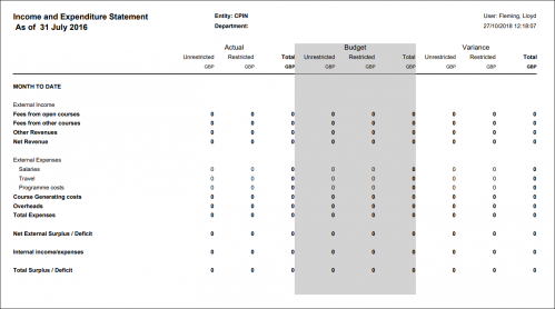 I've got one more query (can open a new post if you like). I have the text MONTH TO DATE and YEAR TO DATE (top of pages 1 & 2), is it possible to put in a formula to in show the actual month on page 1 and the start and end period on page 2? I've been messing around with this but it doesn't look like this is possible in the row set. I also can't think how to add this to the column set so it's different on pages 1 and 2 (one shows figs for the month, in this case July 2016 and the second page is our full year, Aug 15 to Jul 16).