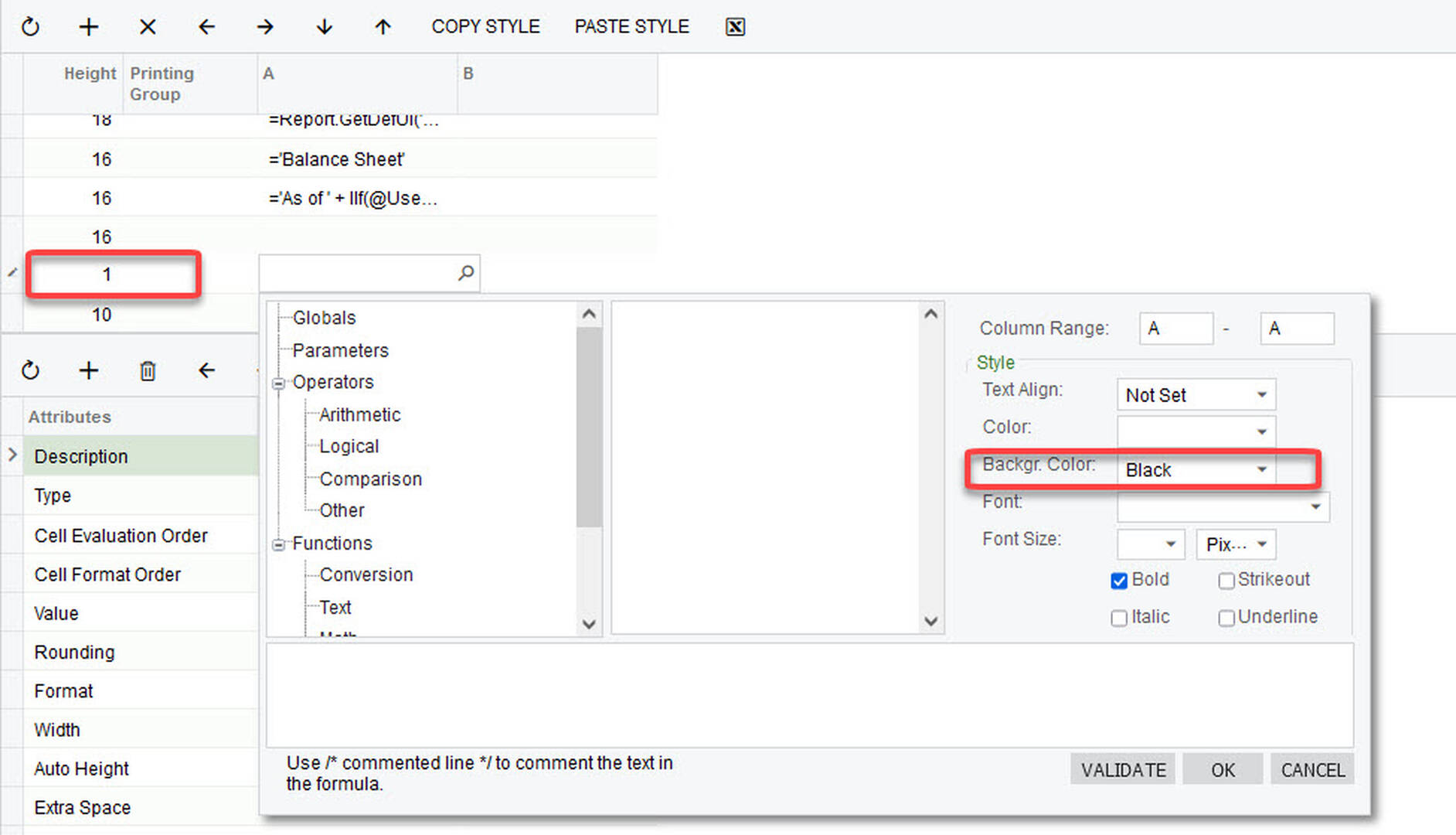I am making some changes to the default 'Profit & Loss - Comparative' report and am puzzled by the line that prints under the report header and column labels.
