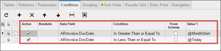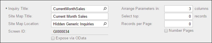 First, I had to build a Generic Inquiry. The key is in the fifth screenshot where you can see the @MonthStart and @Today parameters being used on the Conditions tab. This is what will make the Dashboard respect the Business Date.