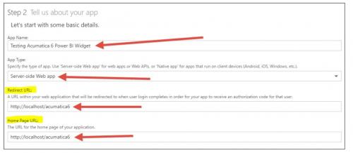 Also, note that I had to use http://localhost/Acumatica7/powerBI/auth in the Redirect URL field like this: