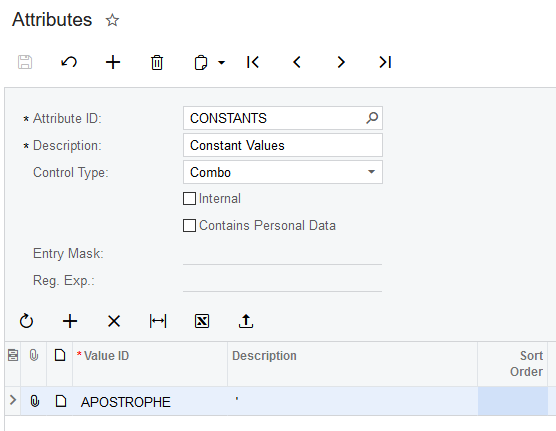 So, you can make an attribute and name it "CONSTANTS". The control type will be Combo. The value will be your key to looking up the constant, and the Description will be what you actually want to appear. In this case, I used "APOSTROPHE" as the Value ID and put in ' as the Description.