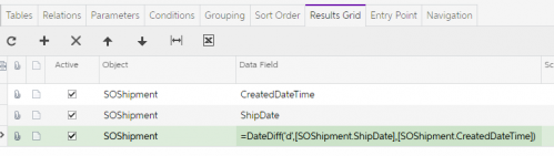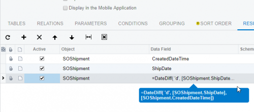 To do this, I'm using the PX.Objects.SO.SOShipment table, and CreatedDateTime and ShipDate in the Results tab. I then added another row with the formula =DateDiff('d',[SOShipment.ShipDate],[SOShipment.CreatedDateTime])