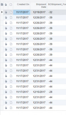 Sorry by wrapping it in the CDate() formula, what should the end formula look like? Like this?: CDate(DateDiff('d',[SOShipment.ShipDate],[SOShipment.CreatedDateTime]))
