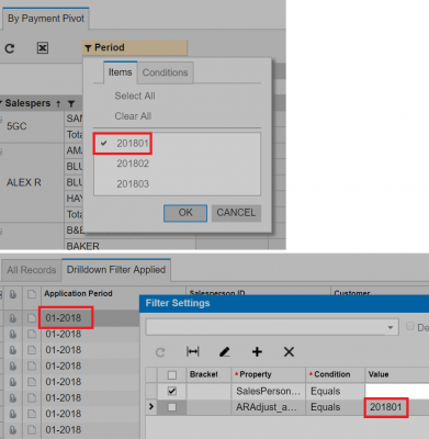 I have checked the filter and noticed that the formatting of the application period is different. It is 01-2018 in GI result, but 201801 in pivot result, therefore, they do not match, hence the filter shows nothing. I even tried to change the formatting of the period on the pivot table to mm-yyyy, but it still kept its own format of yyyymm.