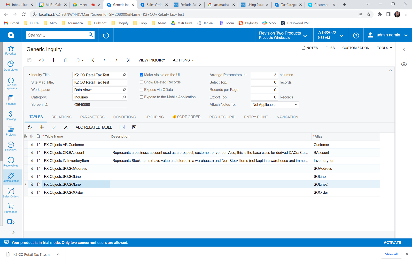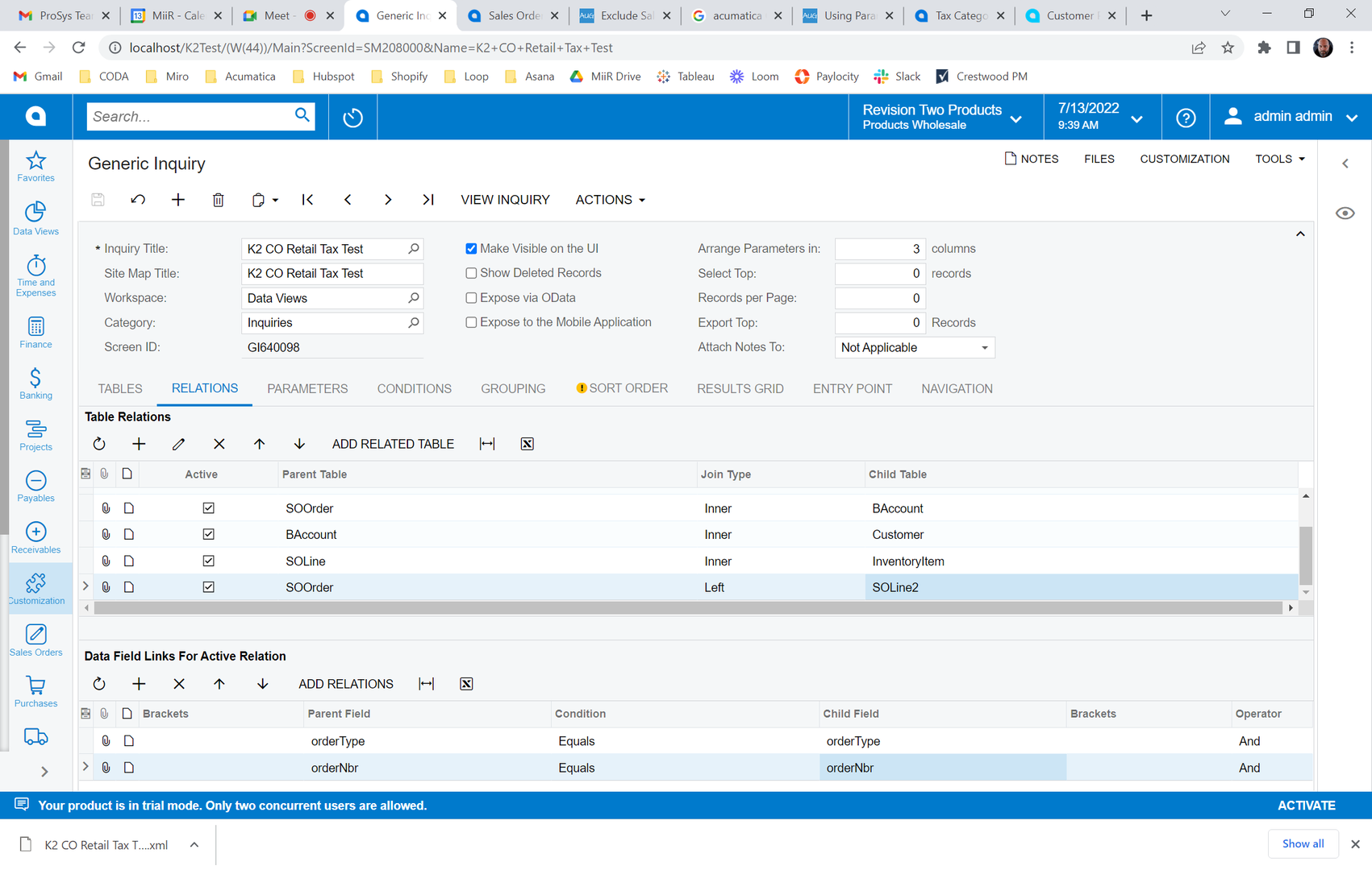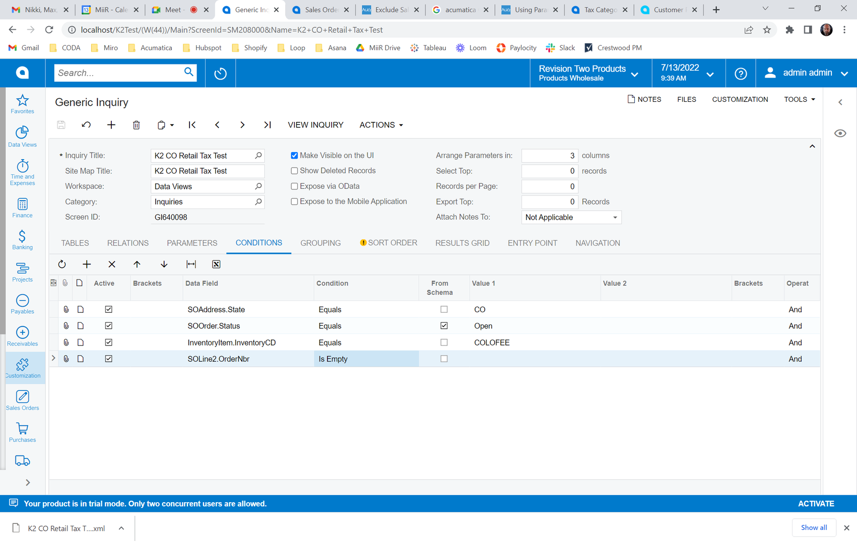 You have the COLOFEE filter on the wrong table (needs to be SOLine2). And you'll also need to join InventoryItem to SOLine2 to apply the filter on InventoryCD. You might need a 2nd join of InventoryItem depending on how you're using it in the Results.