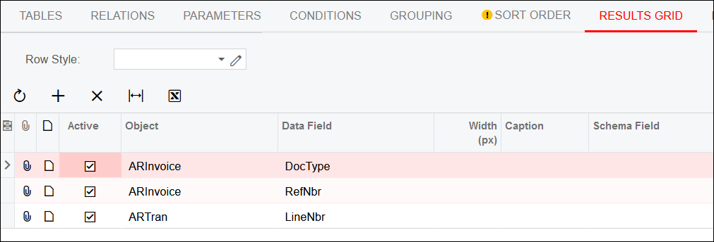 I also like having Width (px) next because it's a text field that allows me to use the down arrow on my keyboard to move to the next row. This is useful when you're adding a lot of columns to the Generic Inquiry. Use tab on your keyboard to move though the Object and Data Field columns, then use the down arrow to move to the next row, all without having to touch your mouse.