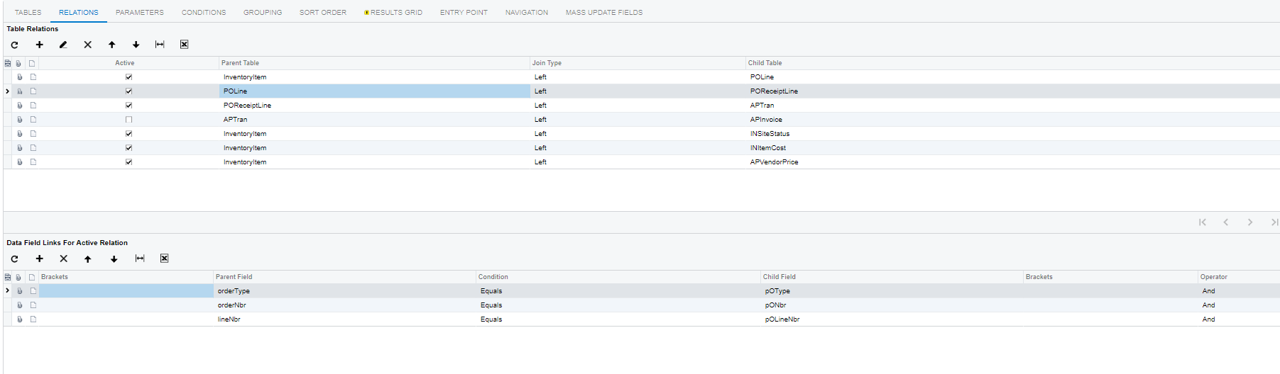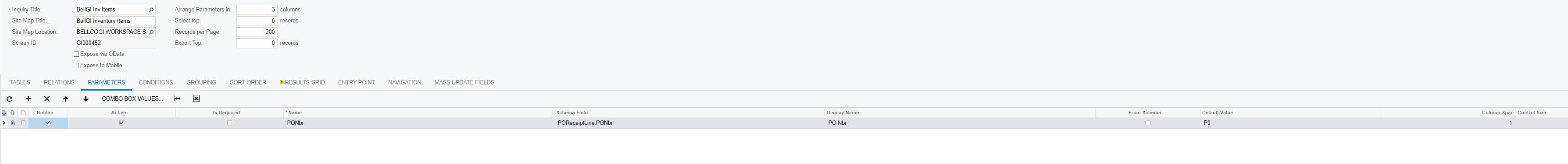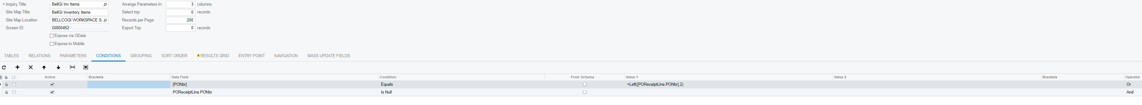 Problem is that in March of 2017 we changed Numbering Sequence for PO Numbers from POxxxxxx to P0xxxxxx ( Changed the O to a zero) This causes the POLine.OrderNbr column in the GI not to showing the latest Purchase Order. I want to display all items regardless if it has a associated PO or not, so I can't filter the old numbering POxxxxxx as a condition for the GI. I am trying to filter out the old PO's by row level in the results page of the GI. I have tried multiple ways but haven't found the right solution yet. Need ideas of row level syntax for the POLine.OrderNbr.