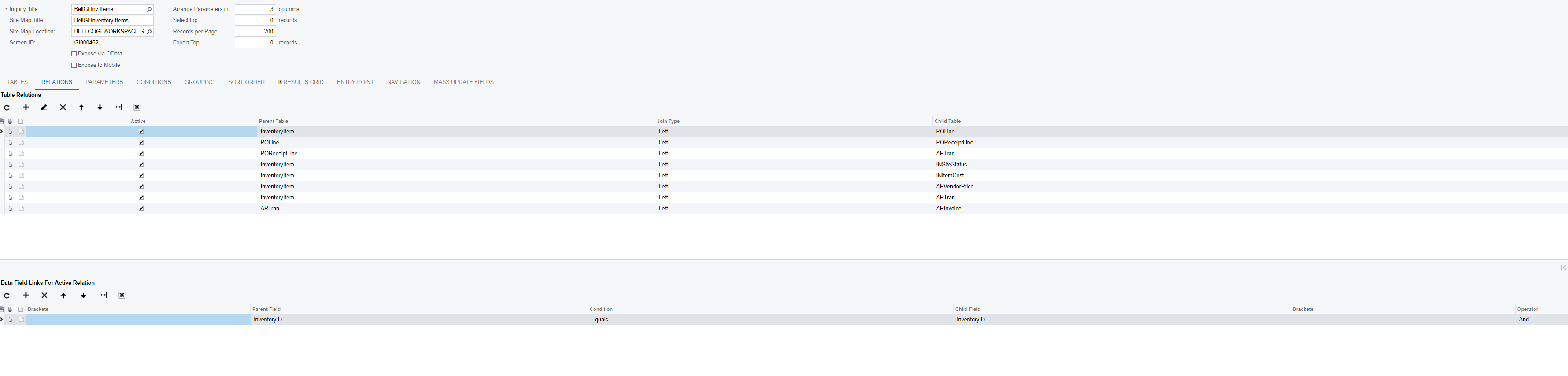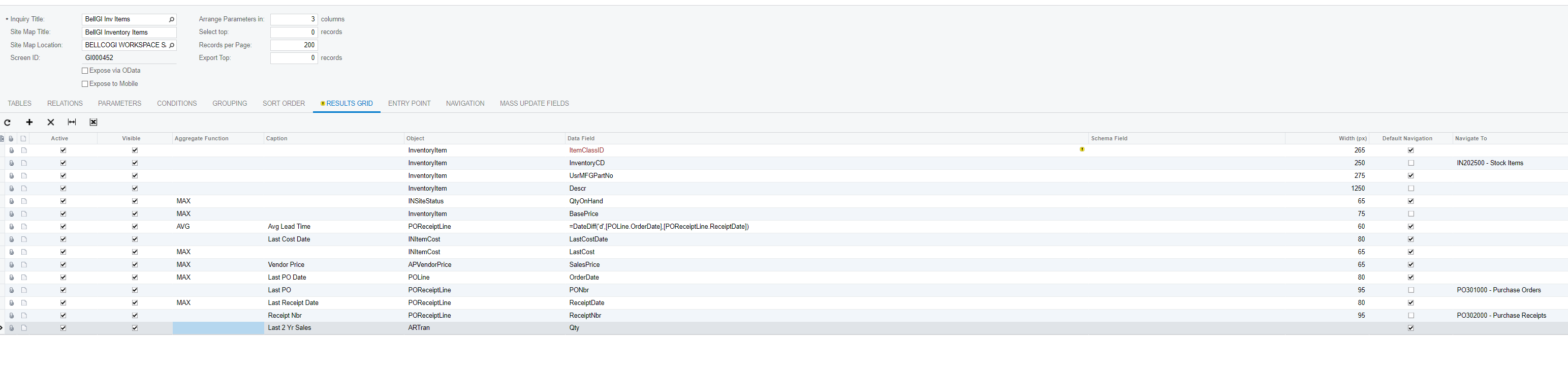 I have created a GI displaying all inventory item data along with Sales Price, Avg Leadtime, Last Cost, Vendor Cost, Last PO, and Last PR Receipt for each item.