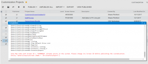 I had published the project once and had all the GI's published in the system once, but I accidentally unpublished all the customized projects. Now when I am trying to publish this particular project which has 94 GI's its giving me error saying "Site Map node with screen ID= 'GI.....' already exists in the system'