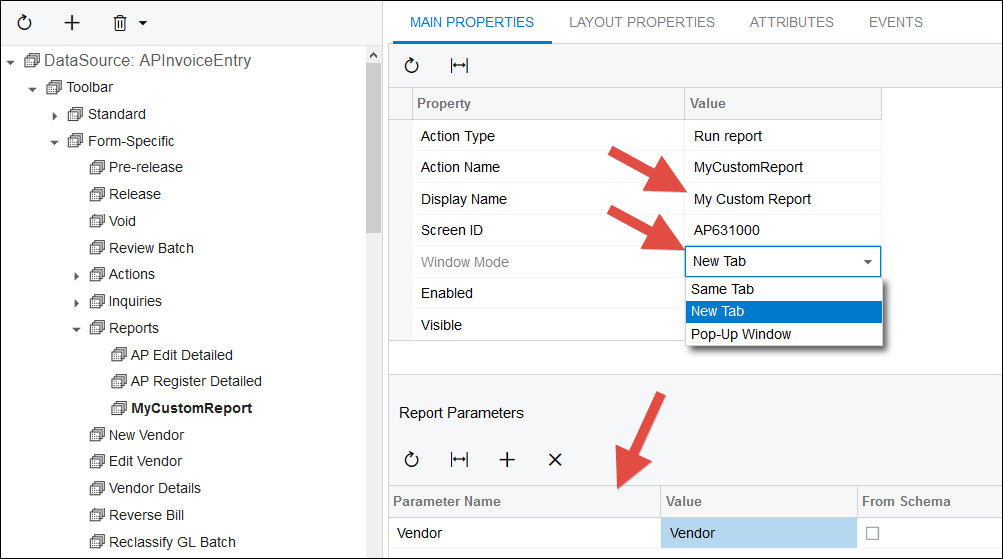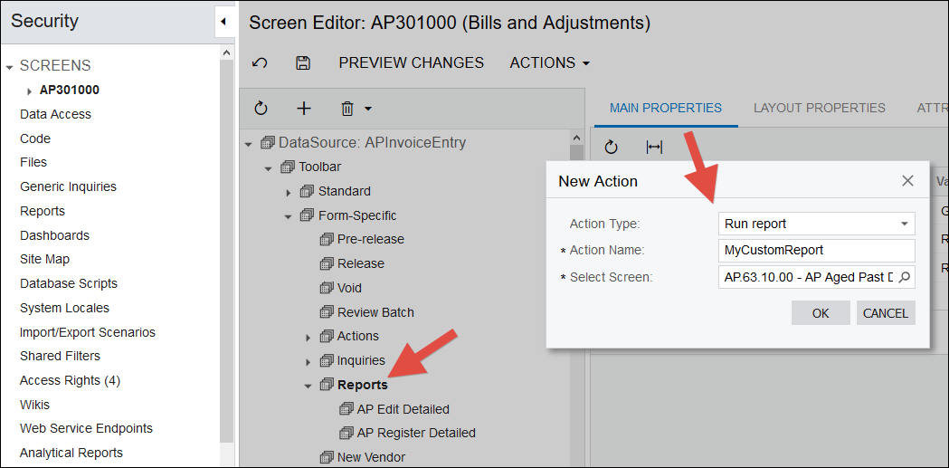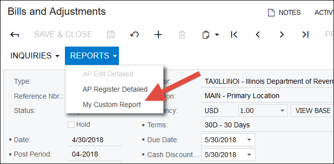 Acumatica has confirmed that you cannot use automation steps to add a custom report to the drop down reports menu on the AP30.10.00 screen. Do you have any ideas on how to do a customization in order to get a custom report added to the reports drop down on that screen?