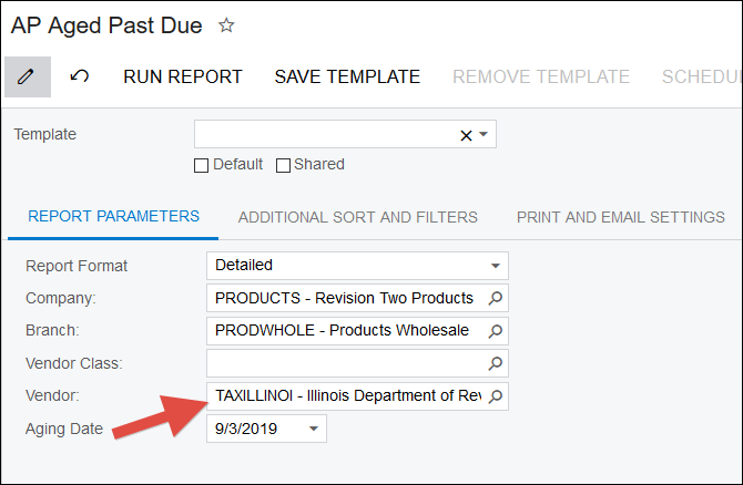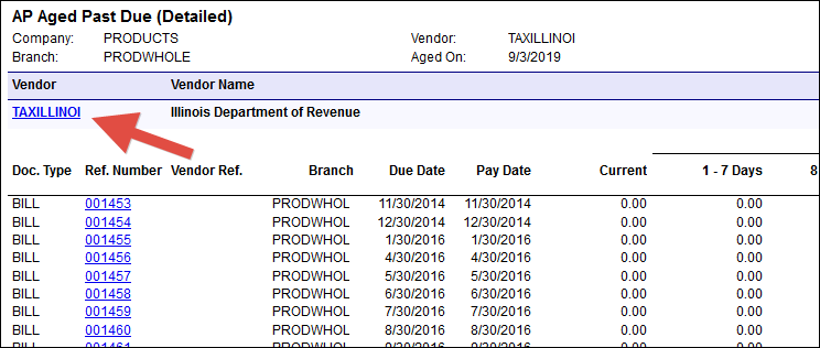 After publishing the Customization Project, you'll see the custom report. In my example, clicking the report will open it in a new tab and pass TAXILLINOI to the Vendor parameter: