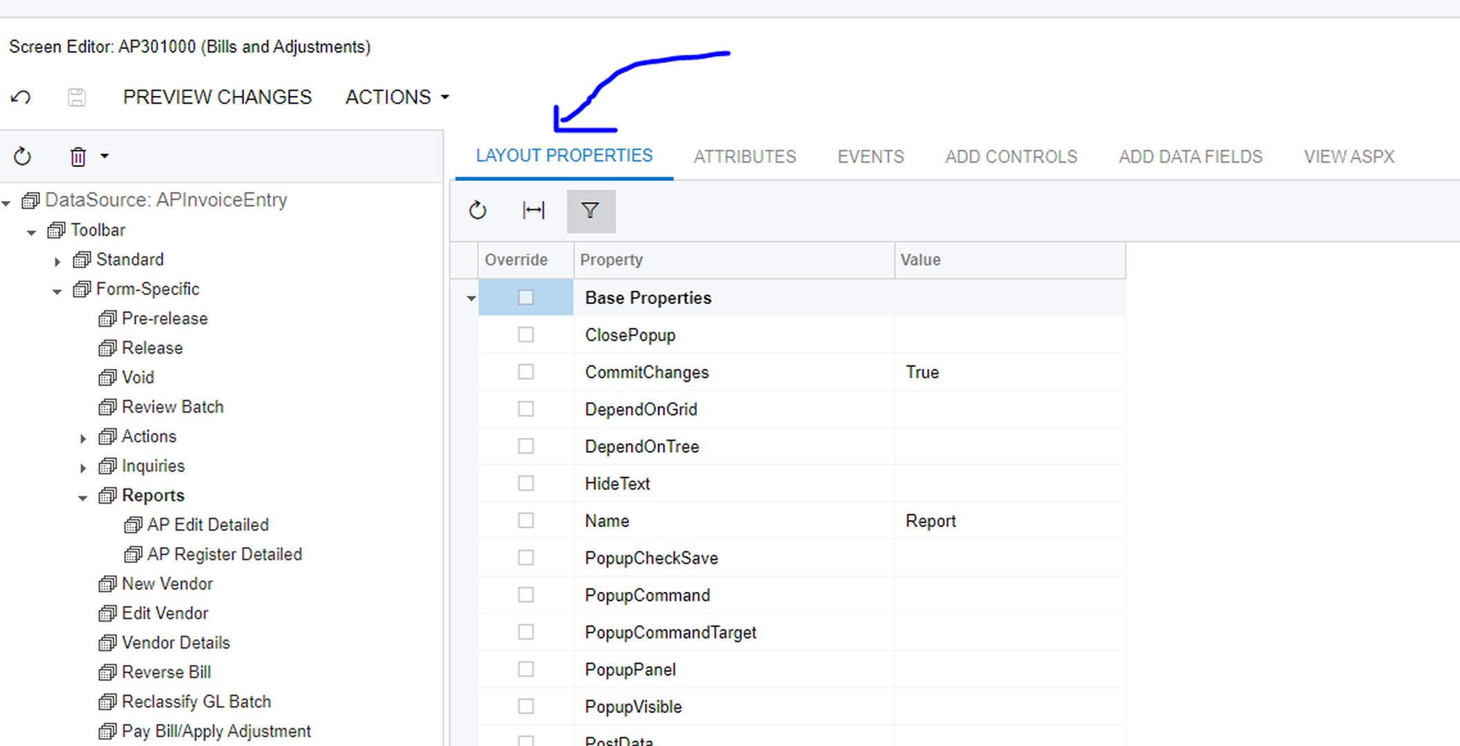 Acumatica has confirmed that you cannot use automation steps to add a custom report to the drop down reports menu on the AP30.10.00 screen. Do you have any ideas on how to do a customization in order to get a custom report added to the reports drop down on that screen?