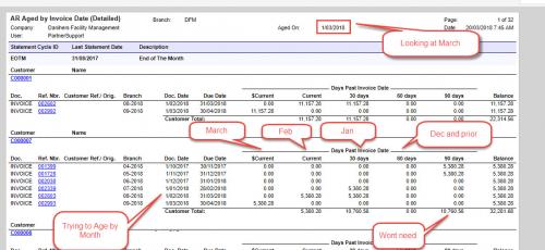 I have attached the Aged report which i am trying to update as well as a screen shot of what i am trying to achieve as the final outcome. I got a bit further with the aging by changing the variable AgeBal00,AgeBal01,AgeBal02,AgeBal03to look at the Month instead of the day but i am having issues around the "Current, 30 Days, 60 days" part of the report where i cant get the months in the correct columns. Dont worry about the FinPeriod section cause i dont think it is the correct way looking at the report.