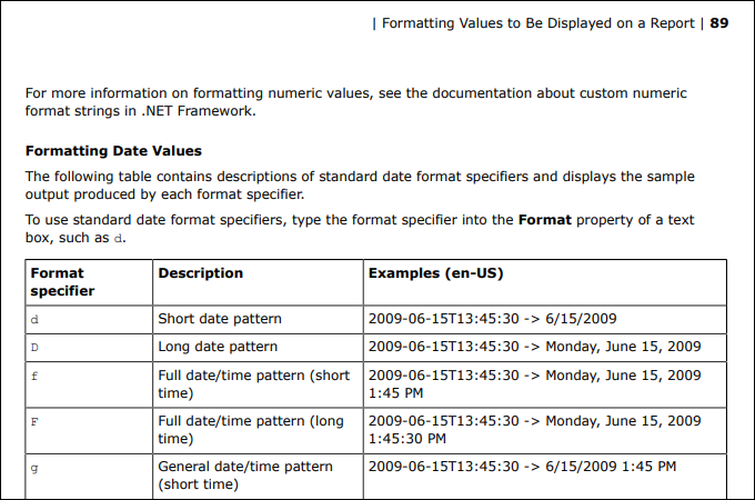 Some of the things I was looking to have documentation for are things like how to format a date in a particular format, how to have specific colours (not just the pre-defined colours), how to format numbers. And so on ...