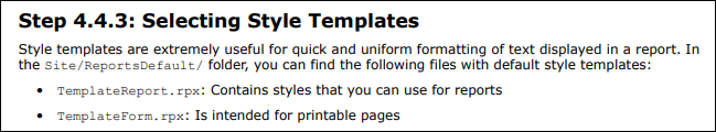 Page 118 mentions style templates which allow you to define reusable styles. You can either define your own or use the out-of-the-box TemplateReport.rpx and TemplateForm.rpx ones: