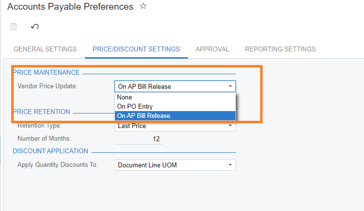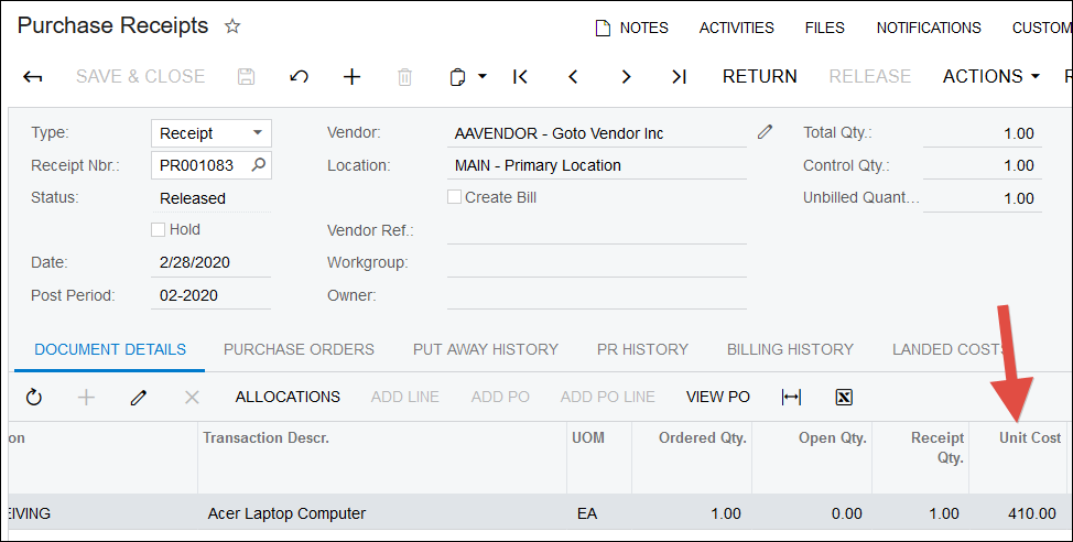 But, there is still a problem in that the Unit Cost field on the Bills and Adjustments (AP301000) screen is defaulting the value from the Unit Cost field on the Purchase Orders (PO301000) screen and not the Unit Cost field on the Purchase Receipts (PO302000) screen.