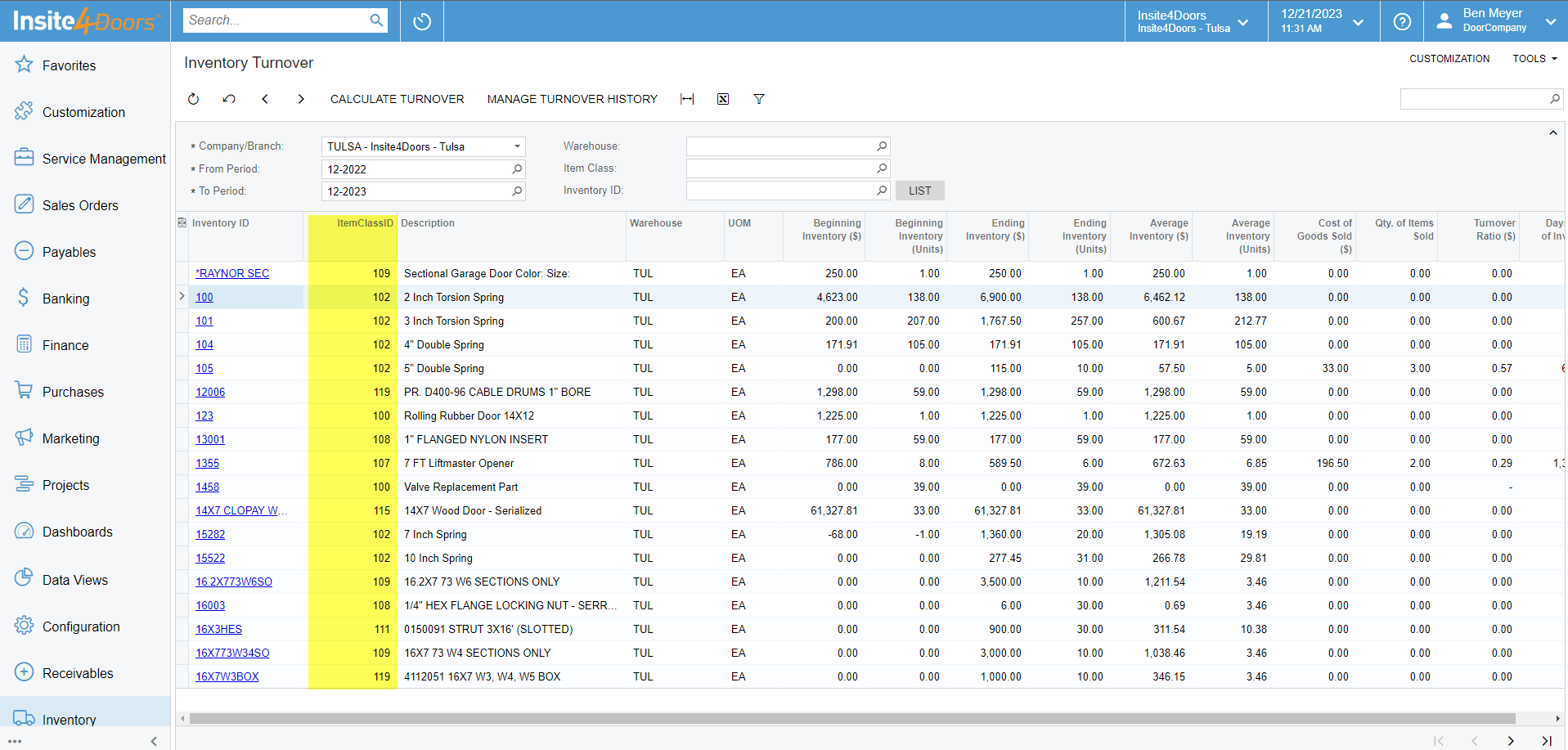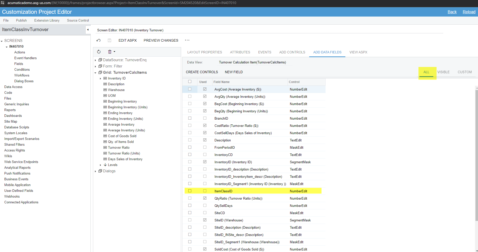 Hi everyone. This is my first question I am asking in here, so please forgive me if something like this has been asked elsewhere and I missed it. I am currently attempting to implement a no-code custom where I am adding the ItemClassID column to the TurnoverCalcItems grid in the Inventory Turnover Inquiry (Not a GI). Our customer is wanting to see these item classes so they can sort in excel for a physical count they have coming up. The problem I am having is that when I add the data field (which is under the "all" tab and not the "visible" tab) to the grid it seems to be locked as a NumberEdit in the control section of the field.