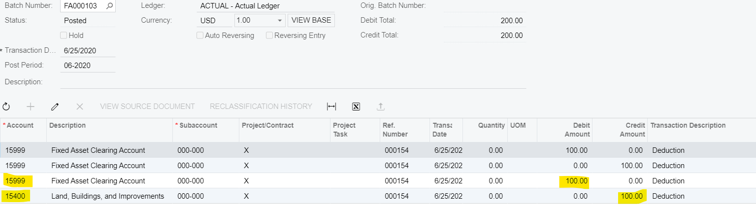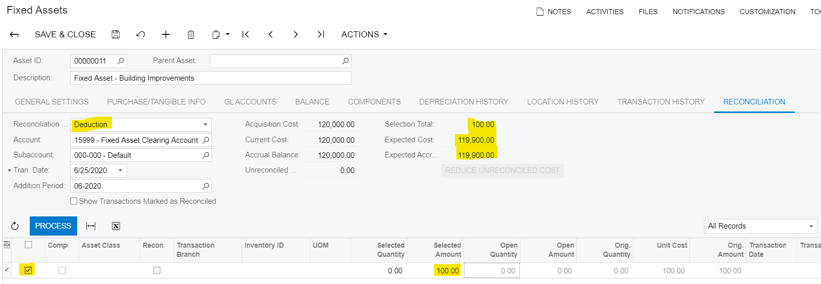 Once you hit process, the system will create a reconciliation entry within the FA module to reduce the value of the asset. The entry as part of this process debits fixed asset clearing, and credits the fixed asset account.