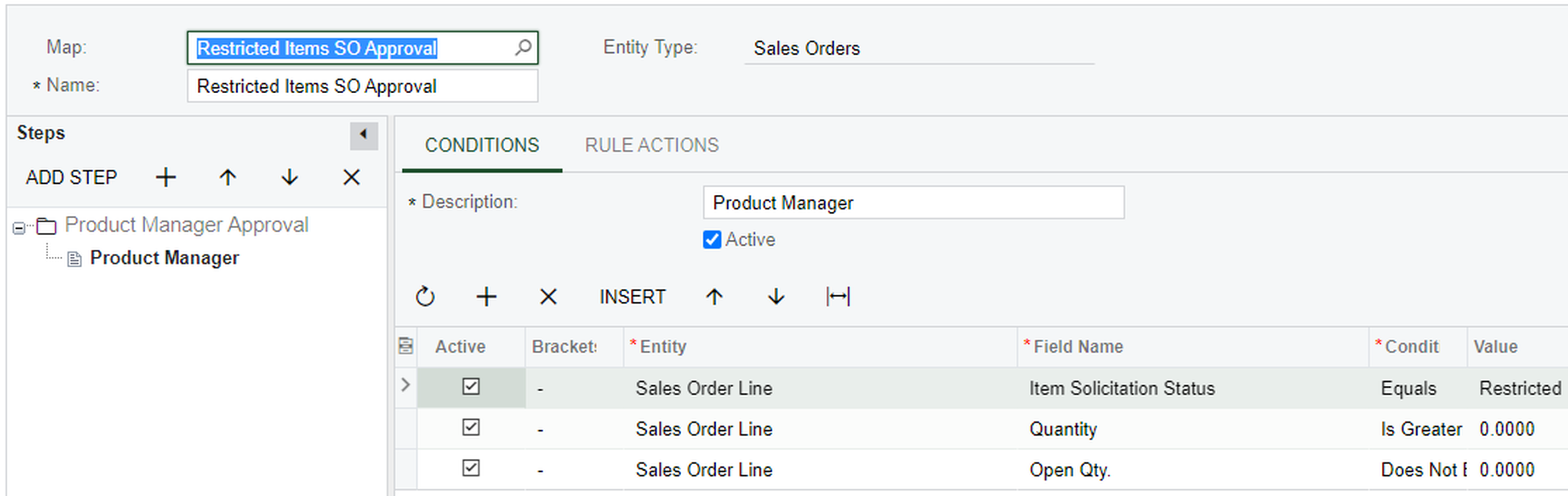 The problem I am running into it in the conditions tab. My idea is to create parallel conditions where the Manager for that Line item is checked and the system will ping a workgroup that contains the two approvers for one of them to give the okay. I realize now though that the "Conditions" tab does not seem to have visibility that far down. I believe it is only able to see everything on the sales order only and that the "Rule Actions" is what allows the drill down into the actual Item Form Data when selecting who should approve.