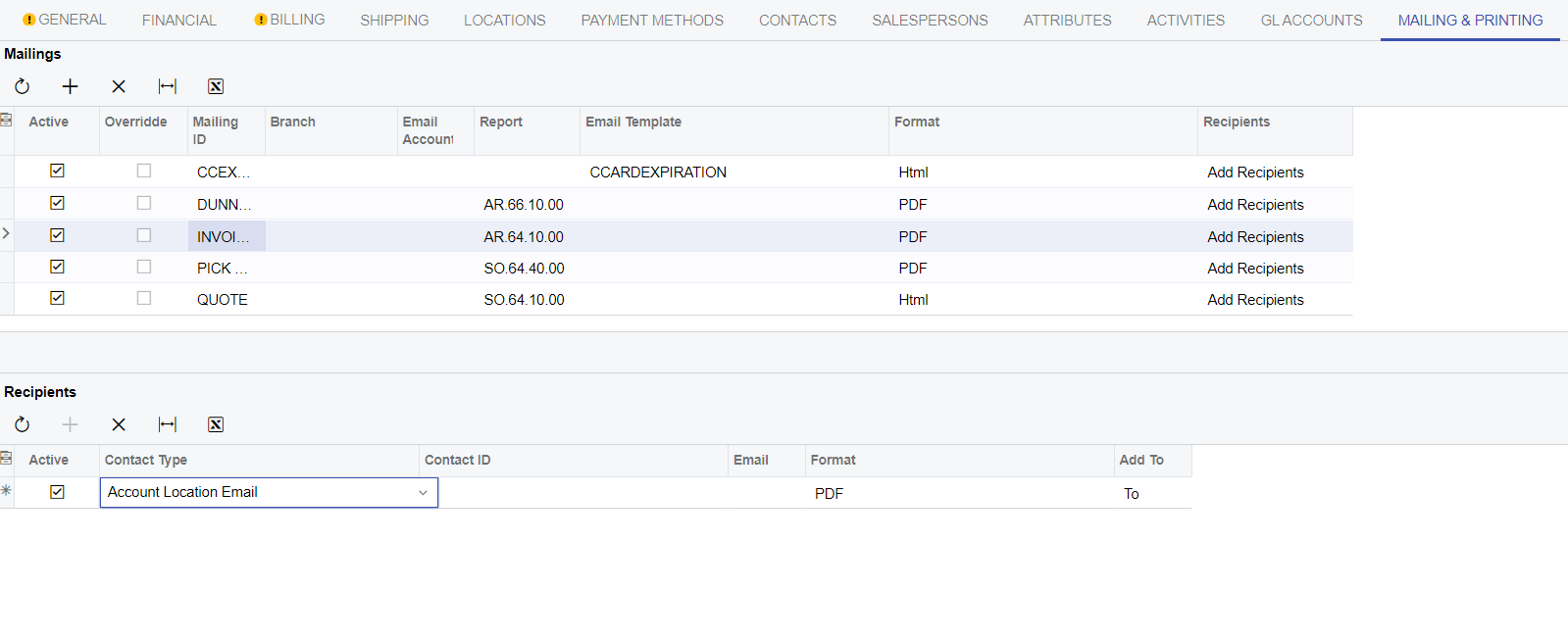 Reactivating this thread because I am trying to do the same with but with Sales Orders where we have several locations for each Customer Account with Customer Location-Specific email accounts for each. We are currently in 2024 R1 and have not been able to figure out a way to send location-specific contacts without general contacts or the ship-to contacts overriding anything in the recipients field. I have tested as the SO Preferences and at the Customer Account level from the Mail & Printing tag, like @pankaj-saluj suggested.