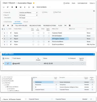 The Automation Step to add the report option is defined out of the box in 2018R1. Our admin user has no trouble with the access rights, but our finance user does. Can you point me to why the automation step entry for the Report menu in AR301000 does not allow access to the AR622000 report when the user CAN run it if they go directly to it through the menus? (i.e. Does the automation step hit some other permission we need to grant our locked-down user that an admin user has by default?)