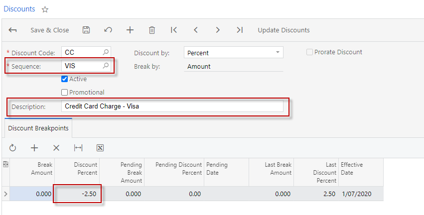 The set-up of the discount also has the advantage of Sequence Number, so you can add multiple charges if you have them. i.e Visa -2.5%, Mastercard -1.5%. I know it may not happen, but it is there if needed.