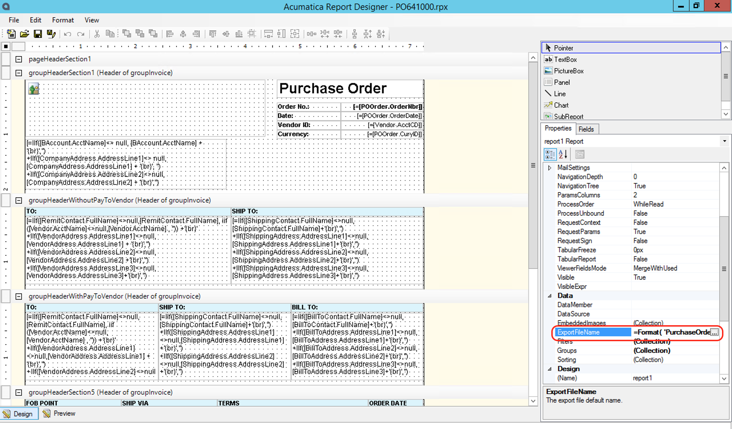 You can use the stnadard formula editor to specify the file name. Not sure what MYOB does out of the box, but the Acumatica OOB file name is as follows: =Format( 'PurchaseOrder {0} {1}', [@OrderType],[@OrderNbr]) which may be what yours is actually doing. In your file name it looks PO is the order type and the order number is 600020.