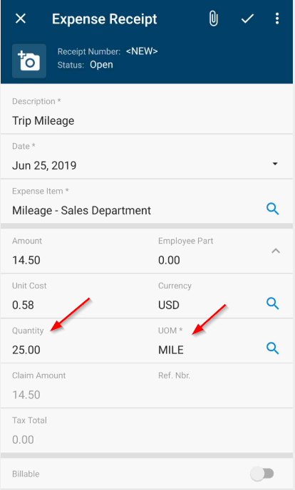 How come the Quantity field does not exist when filling out an expense receipt while on the app? Is there some setting I have to fix, or is this just the way receipts are set up on the app? It's not a huge issue, but if someone fills out a receipt for mileage, the Amount field will populate with the mileage rate, but there is no where to specify how many miles the employee used. This leaves the Claim Amount field stuck at the mileage rate unless the employee manually calculates the expense and overrides the Claim Amount field.
