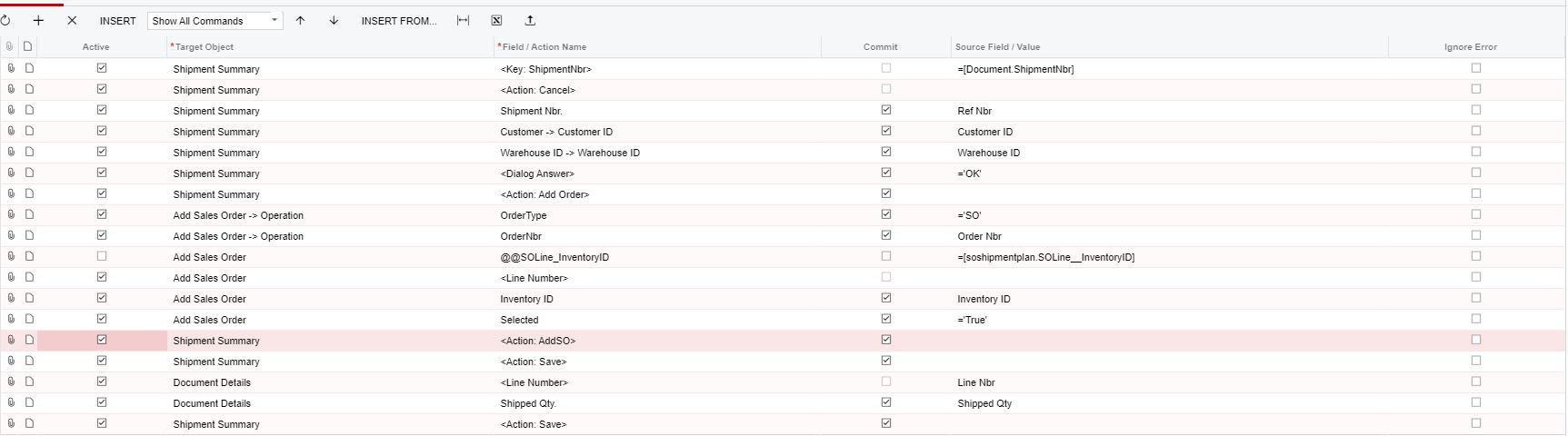 I am trying to create an import scenario which creates shipment for orders. I am able to successfully do this but I can't edit the shipped qty because the qty in the 'Add Sales Order' pop-up is disabled. I tried to reference the shipped qty to the line nbr but it doesn't work.
