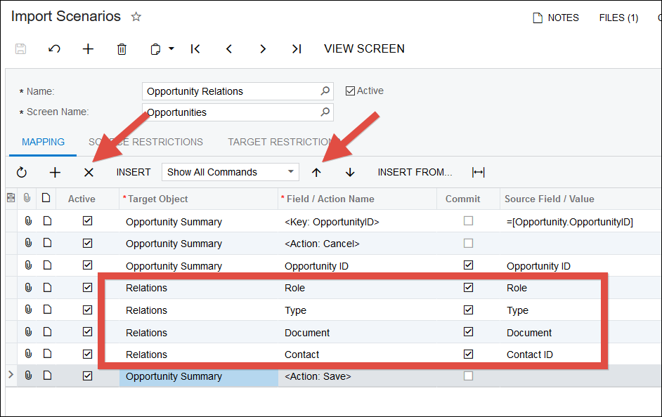 Then use the Import Scenarios (SM206025) screen to map the fields on the RELATIONS tab. Click the + button to add the rows to the grid. Then use the up arrow to move them above the Save action.