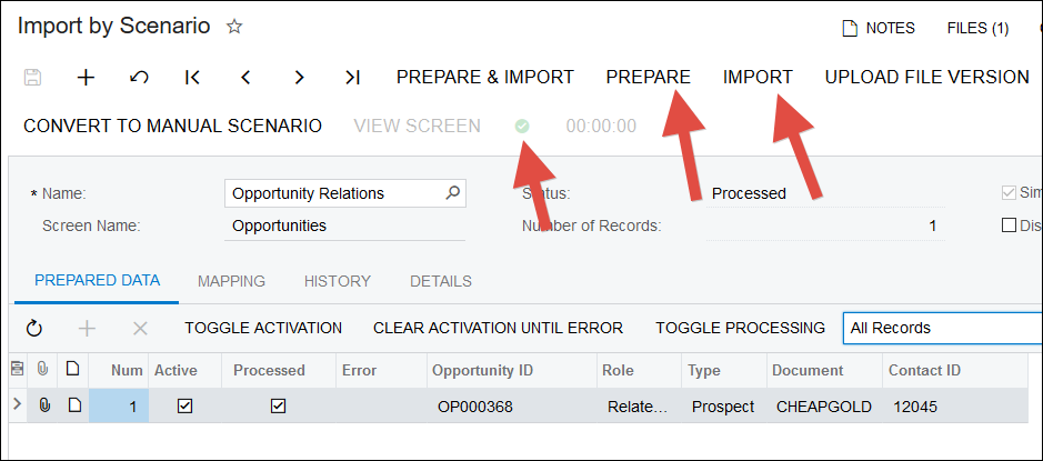 Then go back to the Import by Scenario (SM206036) screen, click the PREPARE button, then click the IMPORT button to import the data. Make sure you get a green check that indicates a successful import.