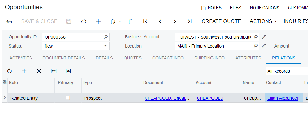 Go back to the RELATIONS tab on the Opportunities (CR304000) screen and note that the Contact has now been added: