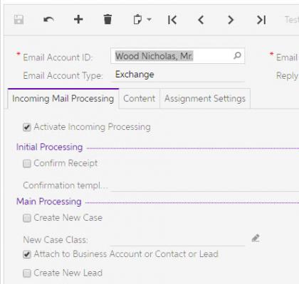 The Incoming Mail Processing configuration for the Exchange account is Activated for Incoming Processing and the Main Processing is set to 'Attach to Business Account or Contact or Lead.