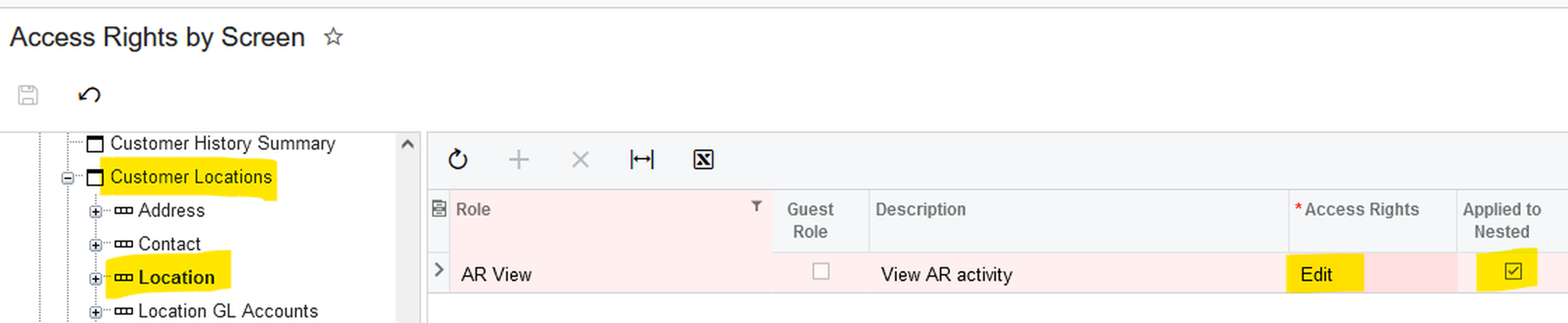 Form Elements: [Receivables -> Customer Locations -> Location -> xxxx] nodes have all inherited the "View Only" access rights from the Form-level.