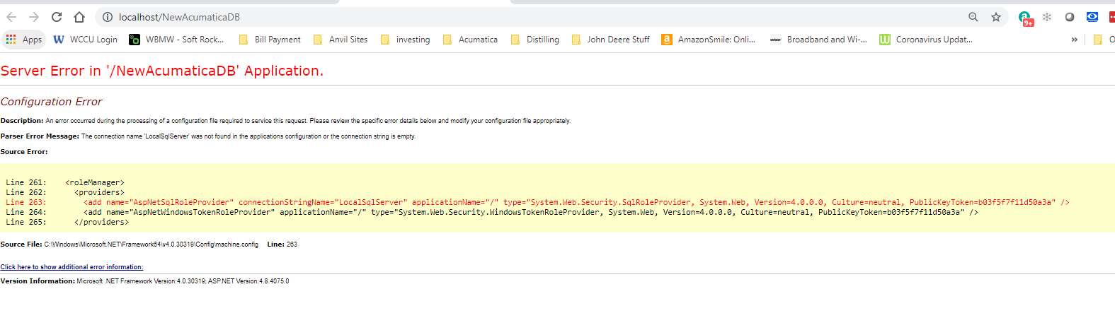 I am attempting to load Acumatica for training and certification purposes and get this error when trying to login to the site. I loaded MySQL and the database loaded. The IIS server is functioning as needed but when I try and load the the Page for the first time I get this error. I cannot figure out the issue but I tried SQLServer 2012, SQLExpress 2017 and also MYSQL both version 5 and 8 and they all load the database but I get this error when I try to bring up the software for the first time. Any assistance would be appreciated.