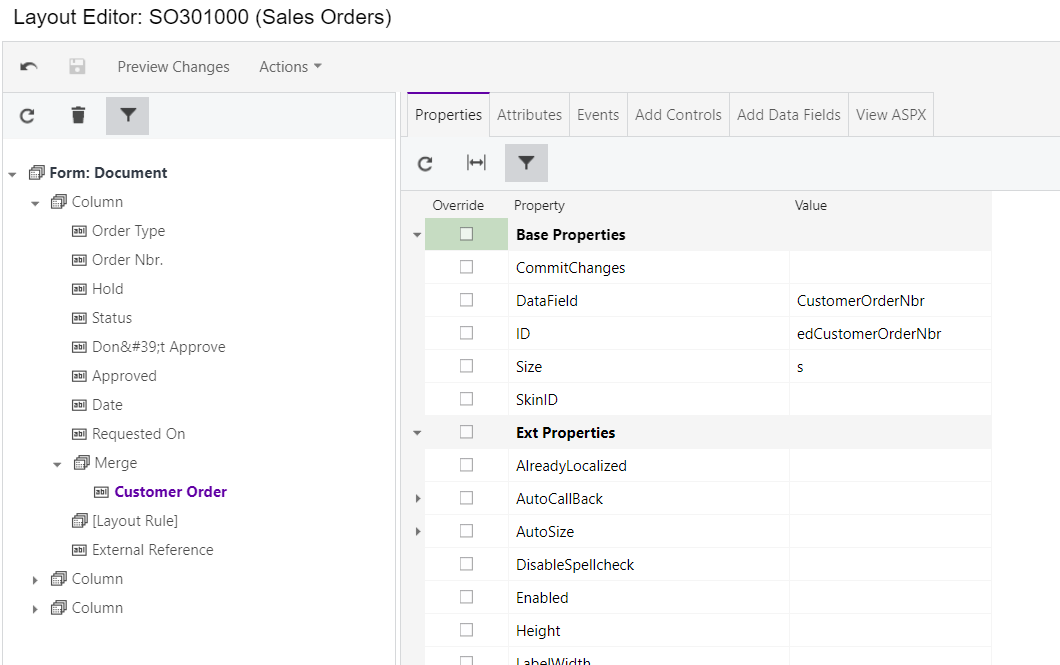 I have updated to make this field required and it works fine for most orders, but orders with the TR type do not have a CustomerOrderNbr field but still give an error saying you cannot save until it is updated. I have been unable to figure out how to either add the CustomerOrderNbr to make it visible even for TR order types or to make the required error exclude the TR order type.