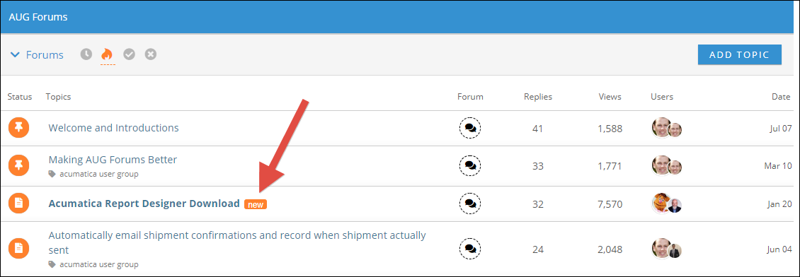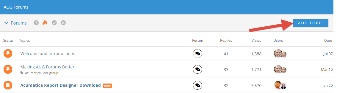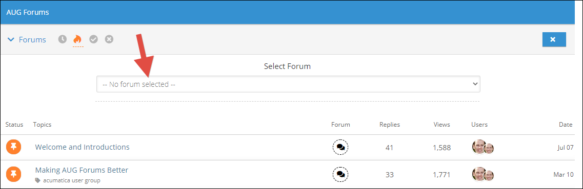 There are a bunch of Forums. Now, rather than having to sift through each Forum individually, you can see all Discussion Topics from all Forums. You can still go into a specific Forum by clicking the down arrow next to Forums in the upper left-hand corner, but Discussion Topics from all Forums will be displayed by default and you can hover over the icon in the Forum column to see which forum a particular Discussion Topic is in.