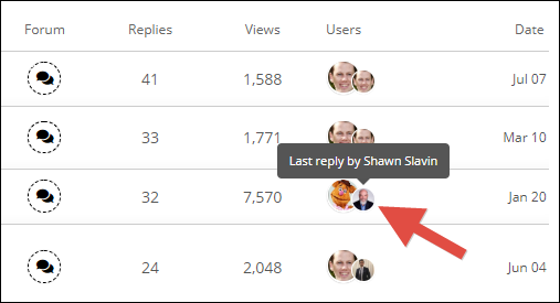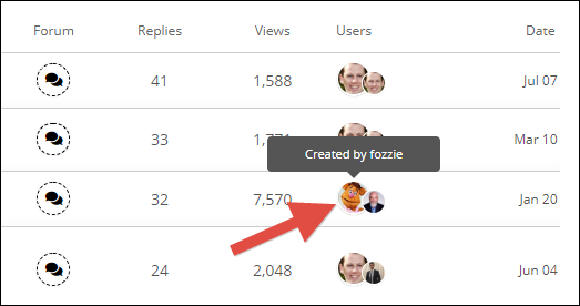 In the Users column, for each Discussion Topic, there are two icons. The larger icon is the user who created the Discussion Topic. The smaller icon is the last user to reply to the Discussion Topic: