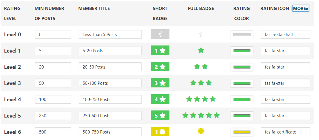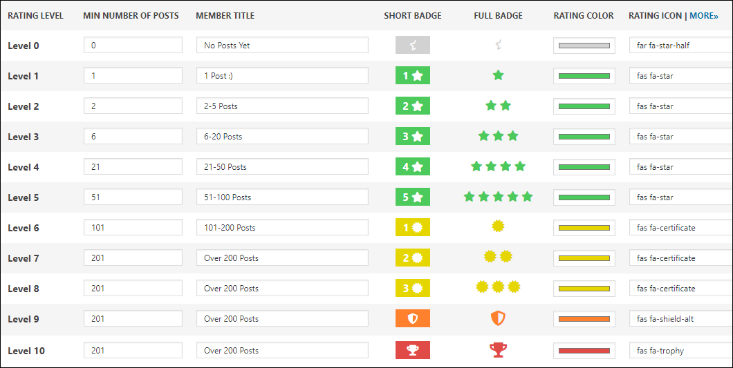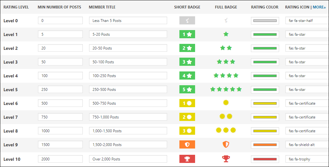 This is what they look like now, with 200 posts being the top Rating Level: