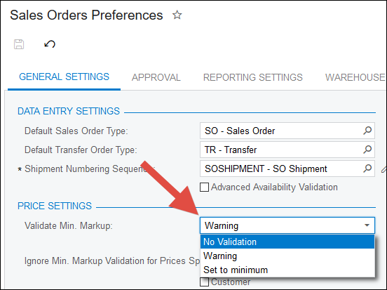 This setting kicks in for every line on a Sales Order when you press Save on that Sales Order. If you select No Validation, then nothing happens. If you select Warning, then you'll get a yellow warning icon on the Unit Price field if you don't meet the Minimum Markup %. If you select Error, then you'll get a red error icon on the Unit Price field if you don't meet the Minimum Markup %Â and the Sales Order won't save.