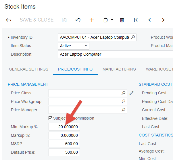 To determine what the Minimum Markup % should be for an item, Acumatica looks at the Min. Markup % field on the PRICE/COST INFO tab of the Stock Items (IN202500) screen for that item:
