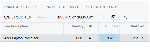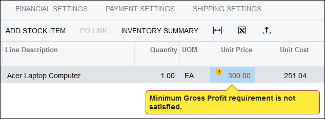 If I set Unit Price to $300, then Acumatica is not happy (because I have the Warning setting selected above):