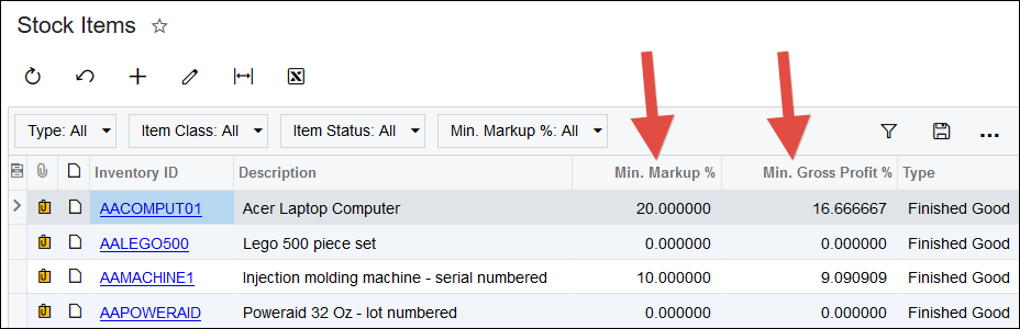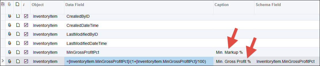 Formula #1 above can be used to add a Min. Gross Profit % field to the Stock Items (IN2025PL) generic inquiry so we can scan through our items to ensure that they are setup to require the Minimum Gross Profit % that we want.